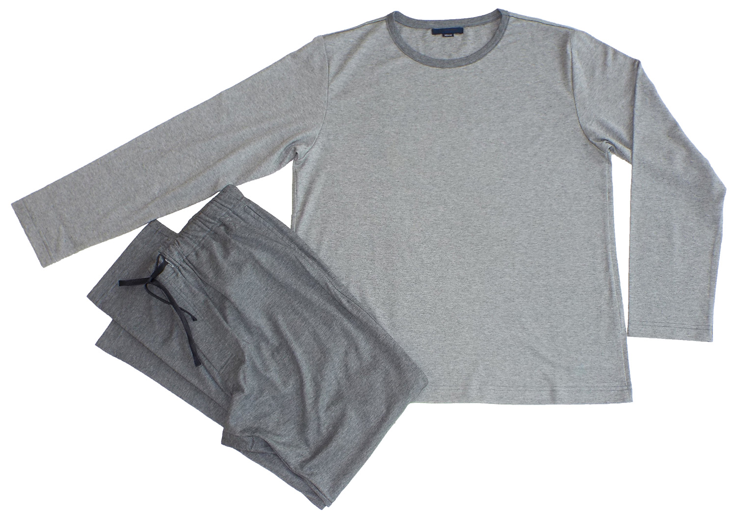 柔らかいニット素材(ジャージ)の上下でトップスは「ヘンリーネック」や「クルーネック」のデザインが多く、ボトムスは裾を絞った「スウェットパンツ」タイプのものが多いようです。